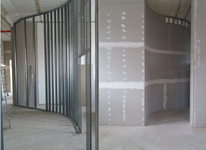 Verkleidungen, Decken, Trennwände, nicht nur gerade Decken und Wände, sondern auch Rundungen in verschiedenen Radien. Prinzipiell kann der gesamte Innenausbau von Wohn- und Geschäftsräumen in Trockenbauweise erfolgen. Spezielle Gipsfaser- und Gipskartonplatten werden an Metallschienen befestigt und anschließend verspachtelt. Aber auch spezielle Brandschutz-, Schallschutz- und Akustik-Eigenschaften lassen sich mit Trockenbauarbeiten ebenso realisieren wie geschwungene Deckenkonstruktionen, neue Fußböden oder der Umbau des Badezimmers.